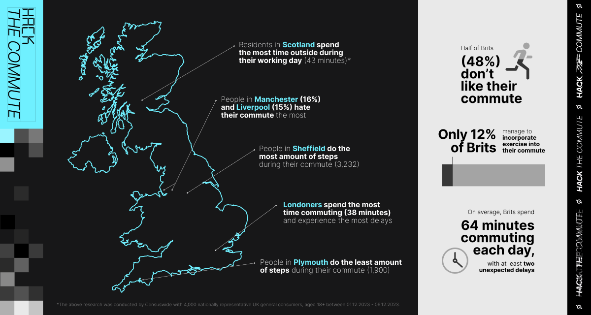 The research conducted by the fitness lifestyle company verifies that, on average, the British public dedicates 64 minutes to commuting each day, with at least two unexpected delays accounting for 22 minutes. This entire experience not only represents a wasted portion of each day, but is also disliked by over half of the public.